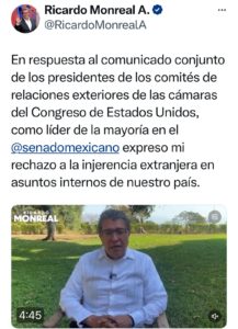 Ricardo Monreal manifestó su rechazo a la injerencia extranjera en asuntos internos de...