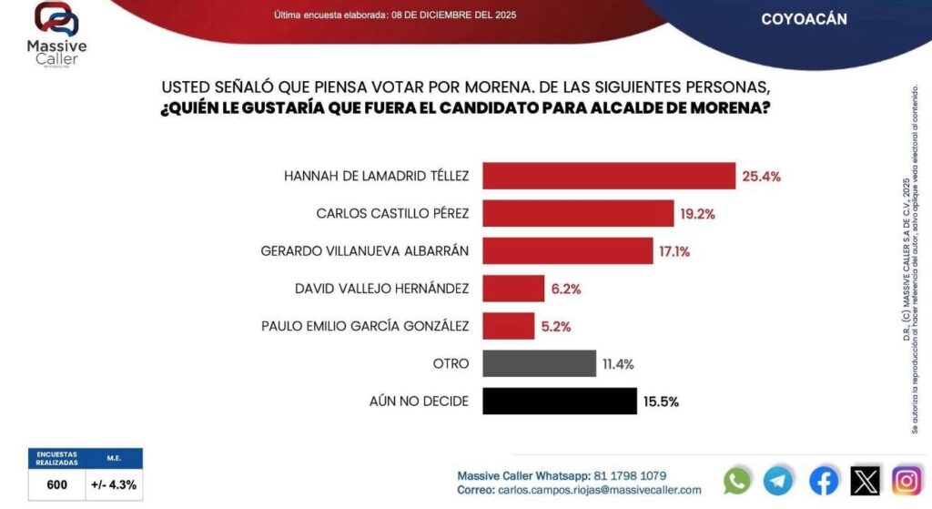 (AGENCIAS) Hannah De Lamadrid cierra el 2025 como puntera en las encuestas para alcaldesa de Coyoacán, por lo que es la mejor posicionada entre los posibles candidatos y candidatas de Morena.