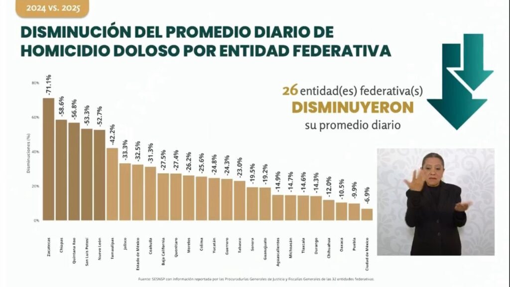 Zacatecas, Zac., 8 de enero de 2026.– Por segundo año consecutivo, Zacatecas se consolida como el estado más seguro de México, al registrar una disminución del 71.1 por ciento en homicidios dolosos entre los años 2024 y 2025, informó el Gobernador David Monreal Ávila, con base en datos presentados por el Secretariado Ejecutivo del Sistema Nacional de Seguridad Pública (SESNSP) durante la conferencia “La Mañanera del Pueblo”, encabezada por la Presidenta de México, Claudia Sheinbaum Pardo.