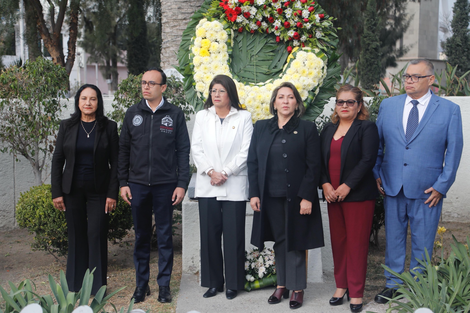 Acompañada por las exalcaldesas de Tecámac, Rocío Miguel Hernández y Lilia Rivera; la diputada federal, Paty Galindo; el diputado local, Samuel Hernández, y el síndico Agustín Delgado, depositaron una ofrenda floral y montaron una guardia de honor ante la estatua del ilustre tecamaquense que se localiza frente al Palacio Municipal.
